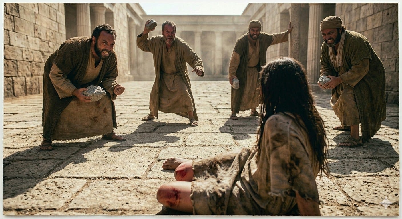 They grabbed my arm. My tunic tore at the shoulder. I stumbled forward into the street, then into the crowd, then into the temple courts, and then that cobblestone came up fast, and my knees hit the rock. The pain shot through me like a declaration.