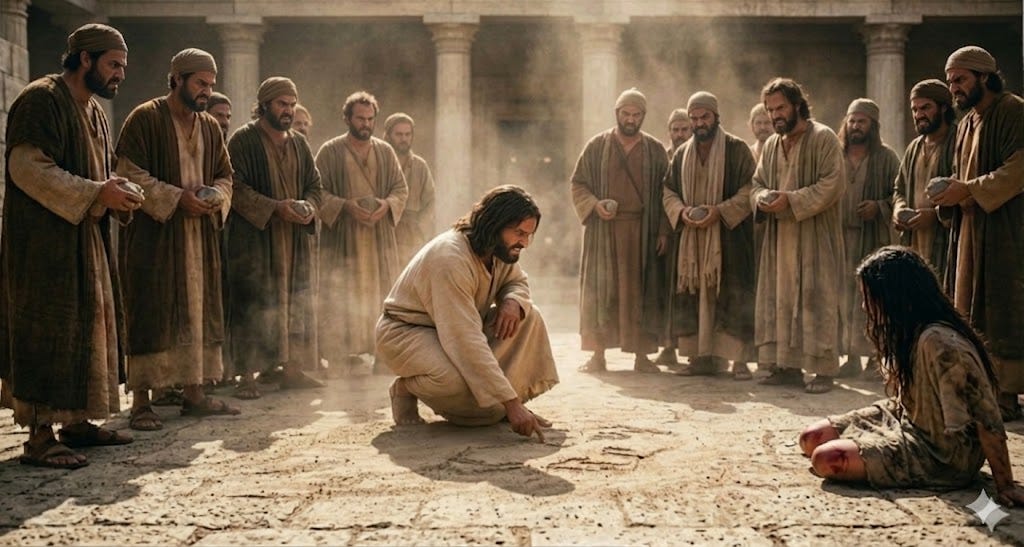 As if the most urgent matter before Him was whatever His hand was sketching in the sandy surface of the temple floor. The Pharisees pushed again, louder, more insistent. Their voices had taken on the edge of men who expected an answer to their demands.