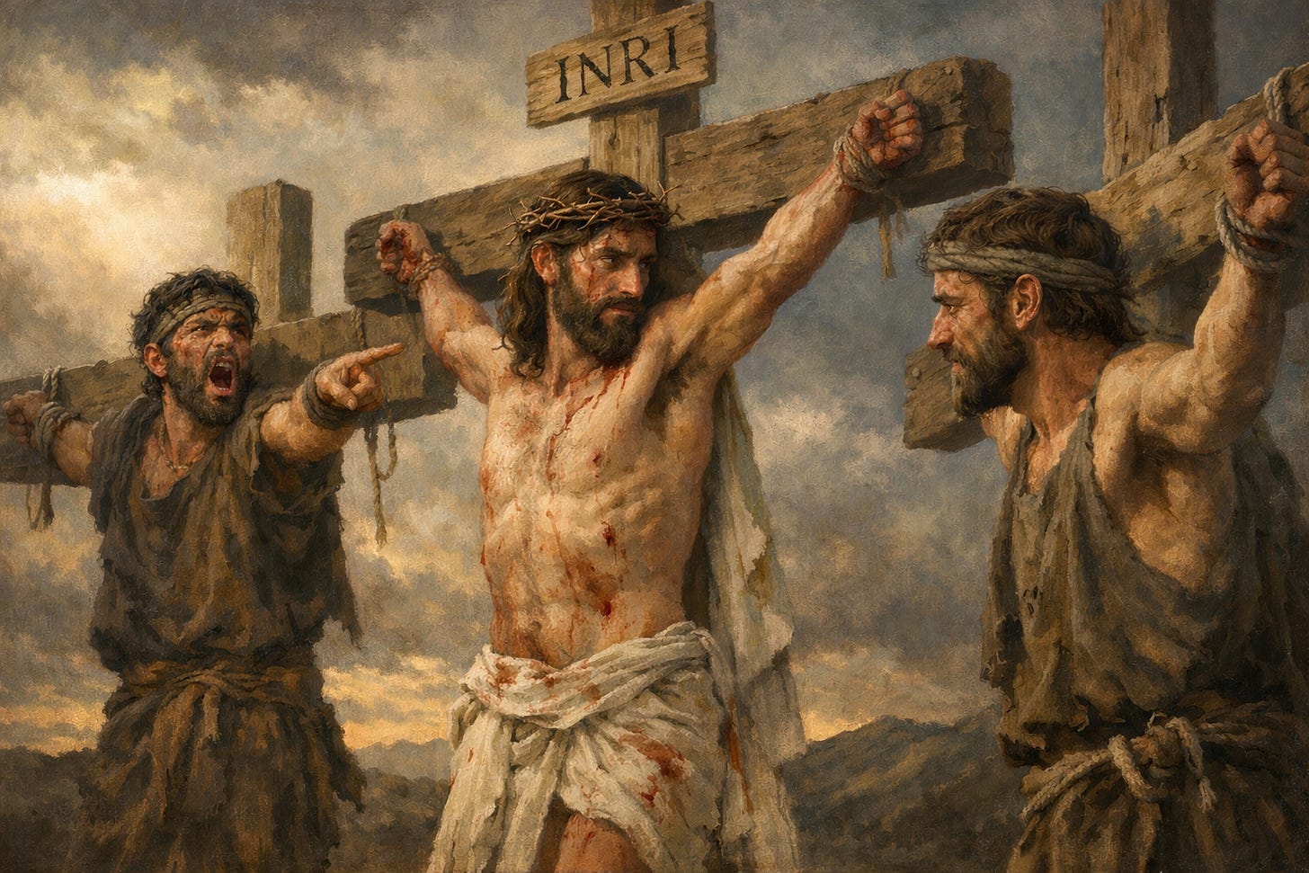 In our modern readings, the two men crucified with Him are often described as common thieves, violent criminals, robbers, or morally hardened men like the one portrayed here. But historically, that is very unlikely.